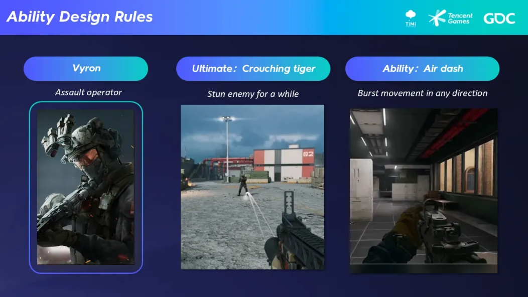兩種核心玩法均靠分工各異、擁有特色戰術裝備和道具的幹員驅動,鼓勵玩家選取適合自己的幹員與戰鬥方式。像GDC上當成範例去展示的國人突擊幹員威龍(Vyron),憑藉虎蹲炮、磁吸炸彈、動力推進這突擊“三板斧”,深受猛攻型玩家喜愛,不止國人愛用,海外玩家也愛用。