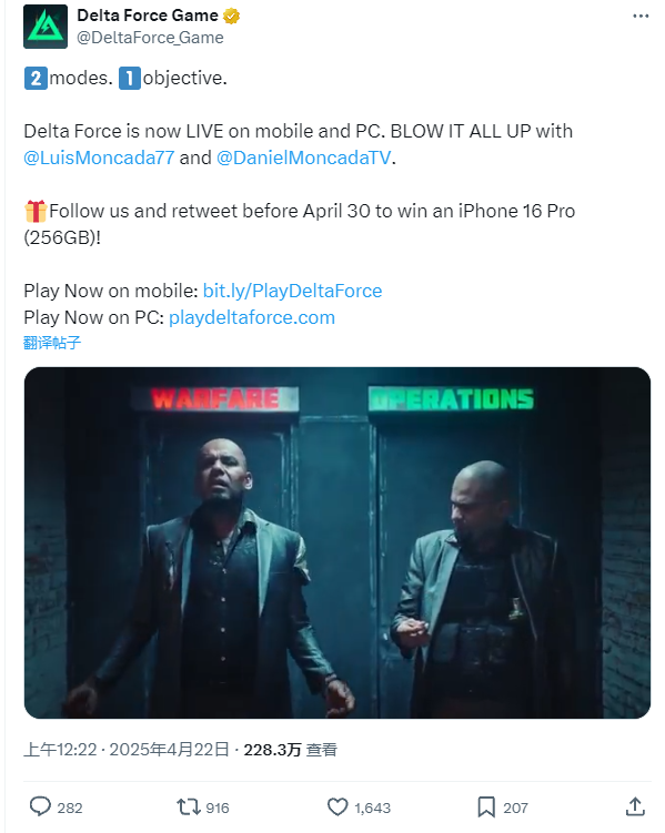 就在4月22日,《三角洲行動》移動端也推出海外版本,同時登陸了169個國家/地區蘋果應用商店遊戲免費榜榜首、125個國家/地區的Google Play商店遊戲免費榜榜首。僅短短四天,《三角洲行動》手遊的註冊用户就突破了1000萬。