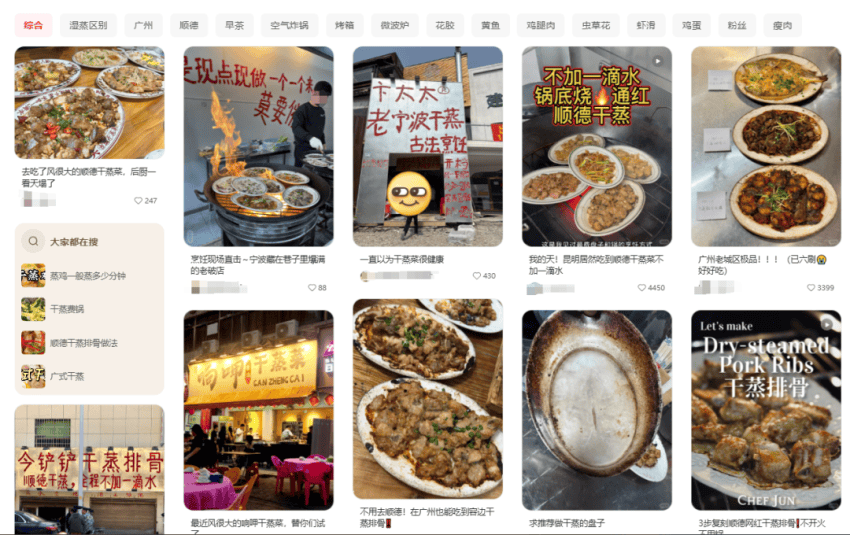 事實上,幹蒸菜此前已在社交媒體上積蓄了一定的熱度,而這些熱度,主要來自廣東順德的網紅店“容邊排骨飯”。在抖音,“容邊排骨飯”話題的播放量達1.3億次,在小紅書也有高達千萬的瀏覽量。
