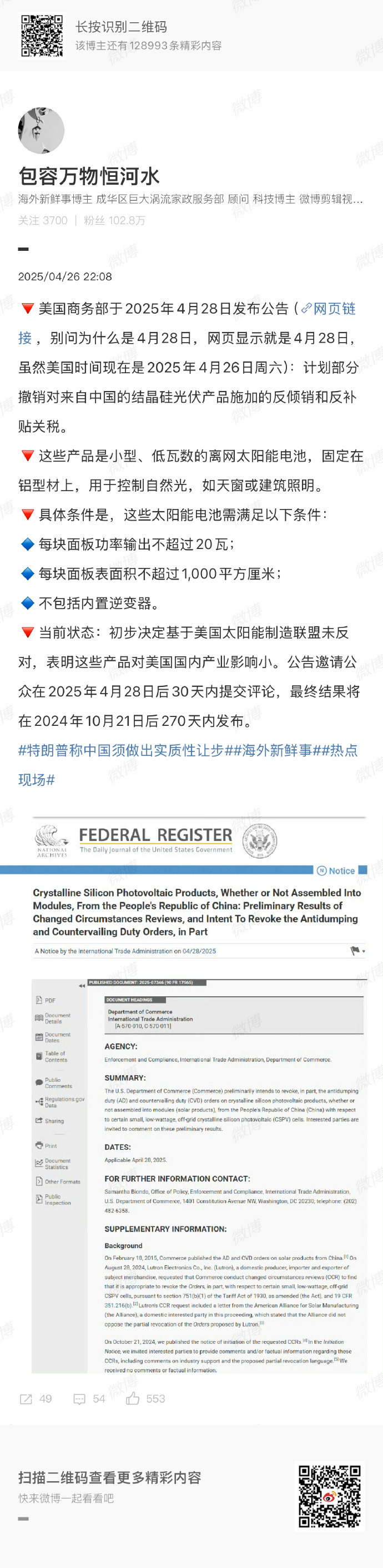 🔻美國商務部於2025年4月28日發佈公告(網頁鏈接 ,別問為什麼是4月28日,網頁顯示就是4月28日,雖然美國發布時實際是2025年4月26日週六):計劃部分撤銷對來自中國的結晶硅光伏產品施加的反傾銷和反補貼關税。