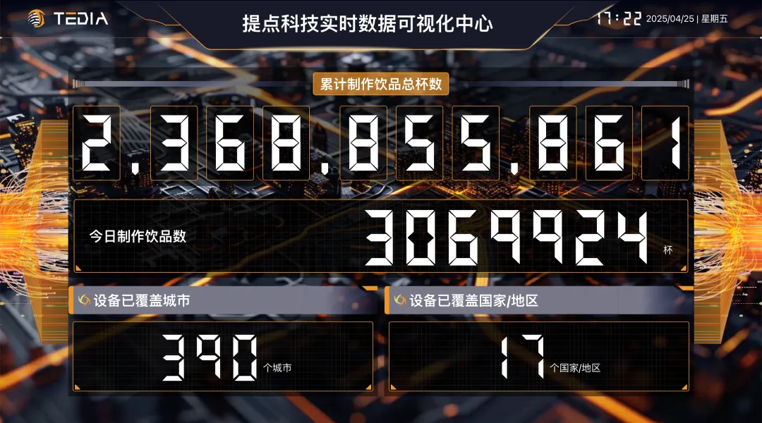 如今,提點科技集團的智能調飲方案交出亮眼成績單——截至發稿前,覆蓋17個國家/地區的390個城市,累計製作飲品總杯數突破23億杯。