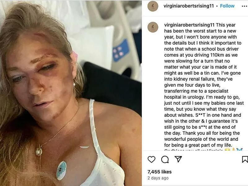 她説:自己的車被一輛時速超過110公里每小時的校車撞倒,事故導致她腎衰竭。照片顯示,朱弗雷女士的臉部和胸部變色,據稱是嚴重的瘀傷。照片曝光三天後,朱弗雷的一位發言人表示,她“犯了一個錯誤”,並沒有打算公開分享這條帖子。