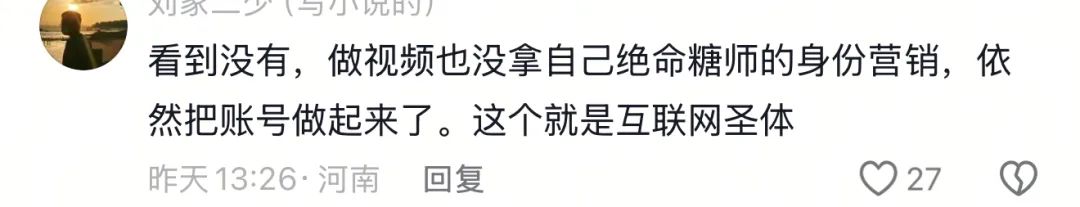 蠻感慨的,要不説強者從不抱怨環境呢,十年前能當絕命糖師十年後還能當網紅,他真的,做什麼都成功,這就是互聯網聖體