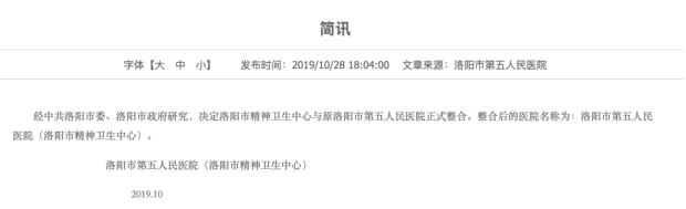 更早前的2019年和2020年,洛陽市有多家醫院宣佈重組合並,包括洛陽市第一中醫院與洛陽市第二中醫院合併為市中醫院、洛陽市精神衞生中心與原洛陽市第五人民醫院整合為洛陽市第五人民醫院(洛陽市精神衞生中心)。