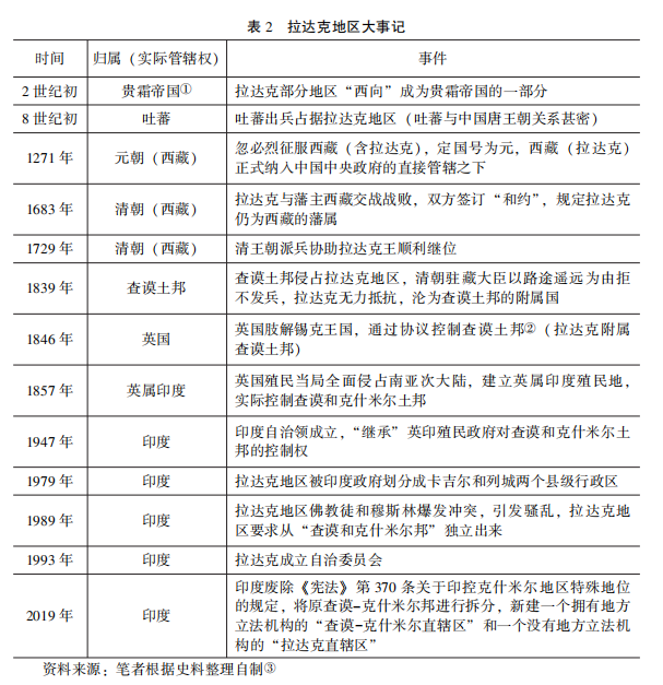 **其次,拉達克地區歷史上長期屬於中國西藏地區管轄(見表2)。**拉達克位於喜馬拉雅山脈西北端北坡、印度河上游谷地,被歷史學家稱為南亞、中亞和東亞之間在高山帶上的“咽喉要地”。7世紀初,吐蕃王朝擴張至拉達克地區,8世紀初征服拉達克地區,使其成為吐蕃藩屬。儘管從10-19世紀40年代,拉達克進入王國時期,但自1271年開始直到1839年查謨土邦侵佔拉達克,其始終都是中國西藏的藩屬國。