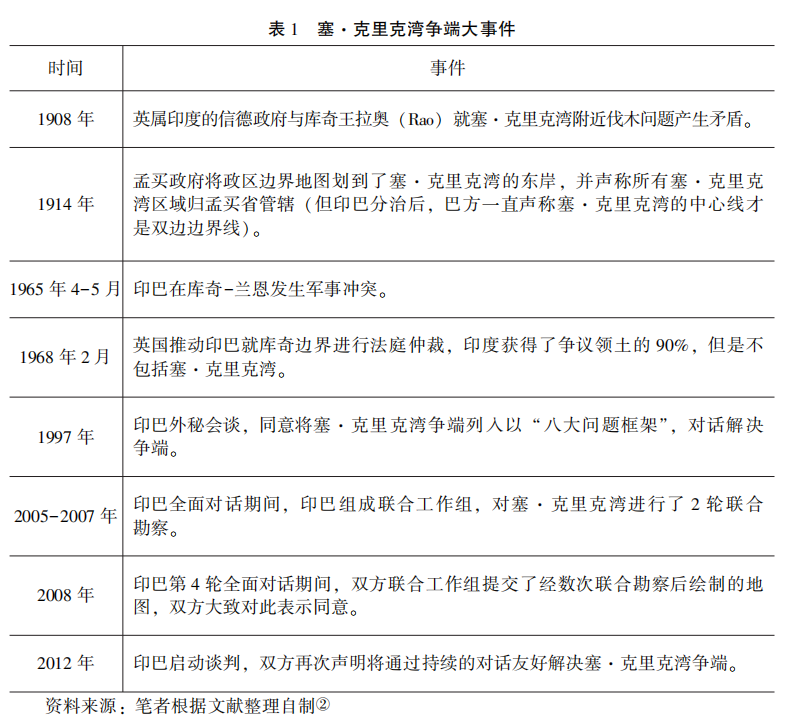 **第四,塞·克里克灣劃界進展不大。**這個印巴“最容易解決的爭端”(Most Easily Resolvable Issues)始終得不到解決,凸顯了印巴和平之艱難。印巴分治之前,英印政府與庫奇土邦(Kutch State) 就在塞·克里克灣歸屬上有爭議,至今爭端已經存在100多年(見表1)。塞·克里克灣屬於庫奇蘭恩地區(Rann-of-Kutch),位於印度的古吉拉特邦與巴基斯坦的信德省之間,是塊無人居住的沼澤地。20世紀60年代以來,印巴在此地區爭奪加劇。1965年4月,雙方爆發了庫奇蘭恩軍事衝突。在英國調解下,1965年雙方簽署了《庫奇協議》,實現了停火,雙方通過仲裁法庭進行了仲裁,但塞·克里克灣水域歸屬不在仲裁範圍內。1999年8月10日,一架載有16人的巴基斯坦海軍巡邏飛機在該地區被印度空軍米格-21戰鬥機擊落,被稱為亞特蘭蒂克事件(The Atlantique Incident),一度引起印巴關係高度緊張。自1969年至2004年,印巴就塞·克里克灣問題進行了8輪談判,進展不大。2004年後在全面對話八大議題框架下,印巴雙方成立了聯合工作組進行聯合實地勘察,展開了多輪會談。2008年,聯合工作組曾聯合繪製了塞·克里克灣地圖,印巴兩國政府對此達成一致。但2008年孟買恐怖襲擊事件之後,雙方放緩了塞·克里克灣談判的腳步。特別是2014年莫迪就任印度總理以來,印度在這一問題上態度更加強硬。