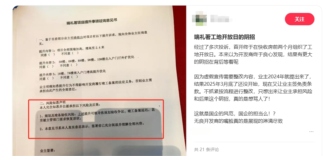 有業主想看看幾個月時間過去,端禮著有沒有整改的誠意,結果剛到現場,就收到了一份來自項目“免責聲明”: