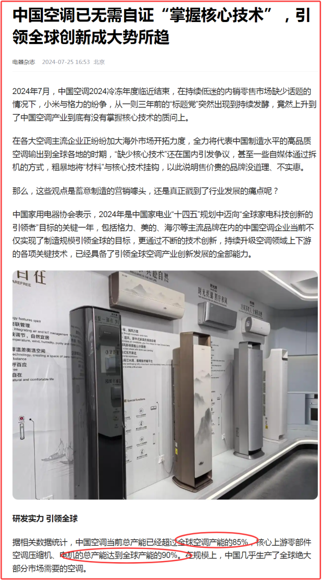 根據《電器雜誌》的報道,中國的空調產量已經佔據了全球的85%,核心上游零部件空調壓縮機、電機的總產能達到全球產能的90%。