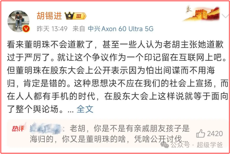胡錫進之流炮轟董明珠,甚至摁着頭逼人家道歉,純粹是斷章取義、惡意炒作,故意製造社會撕裂,往民族品牌企業家身上潑髒水,他這是破壞中國的營商環境。