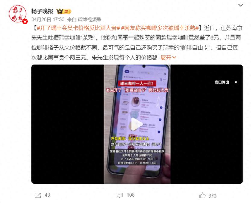 同款瑞幸咖啡價格差6元、開了瑞幸會員卡價格反倒比別人貴?近日,瑞幸咖啡被網友質疑“殺熟”。