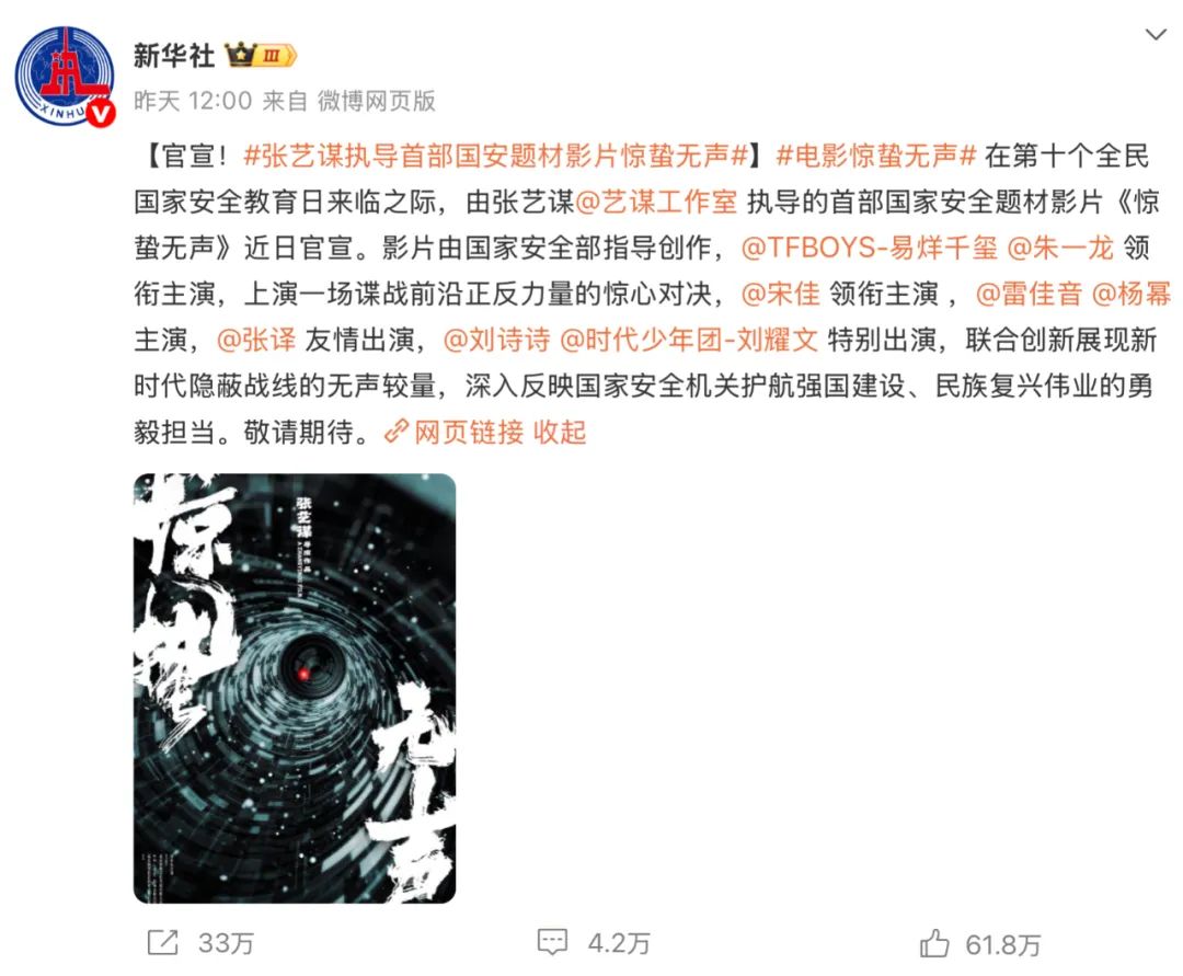 4月中旬,由國家安全部指導創作的新片《驚蟄無聲》首曝概念海報。作為我國首部聚焦當代國家安全題材的影片,這部電影的高規格不難預見:它集結了易烊千璽、朱一龍、宋佳等諸多銀幕熟臉,主演們的歷史票房成績以百億計,新華社官宣微博在短短24小時內就獲得了數十萬點贊……