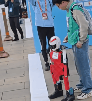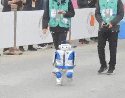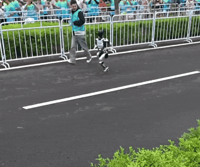 參賽規則並不複雜,既是人形機器人自然要求參賽機器人得有個“人樣”,且用雙足奔跑。除此以外的條件較為寬鬆,比如在控制方式方面,選手可以手動遙控,也可以設置機器人自動跑;又比如在續航方面,主辦方設置了多個電池更換點。半道上換電池也行,不過會罰分。要是實在撐不住了,把機器人換了也行,同樣罰分。