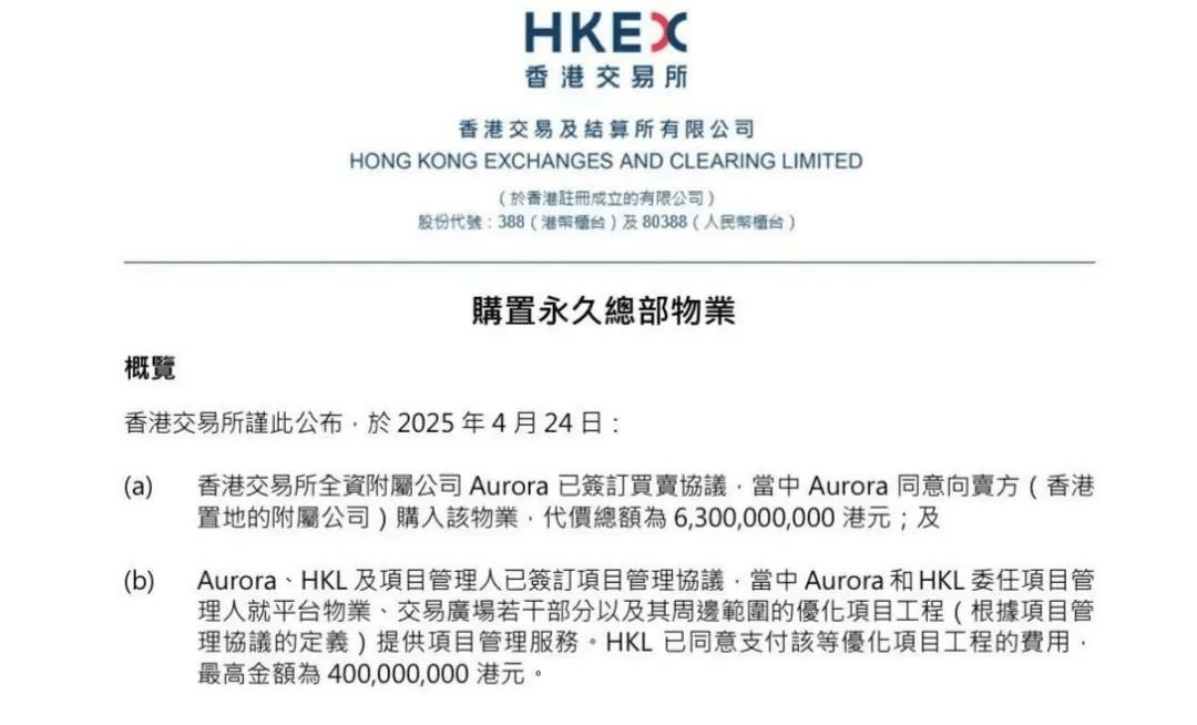 4月24日,“港交所”公佈消息稱,耗資63億港元,向香港置地購入“中環交易廣場”一期相關物業,作為集團總部及辦公室。過去40年港交所一直在中環交易廣場租賃辦公樓層。此次是由其全資附屬公司Aurora出面,包括交易廣場一期(第一座)第42樓至50樓連平台物業,實用面積總14.7萬平方呎。