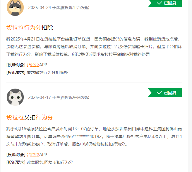 **除了佣金和會員費爭議外,亂扣“行為分”亦成為貨拉拉司機投訴的重災區。**打開黑貓投訴平台,相關投訴已有1萬7千多條,“因為顧客提供的信息有誤,到達裝貨地點後,貨物無法裝進貨箱,與顧客溝通後取消訂單,並向貨拉拉平台反饋貨物超長照片,但是平台扣除了我的行為分,影響了我後續接單。”“多次聯繫客户未果,取消訂單,報備申訴仍被貨拉拉平台扣行為分。”