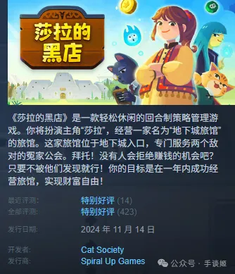 之前手談姬直播過一款遊戲,叫作《莎拉的黑店》。雖然遊戲在搶先體驗階段,但還算不錯。劇情人物可愛,對策略類的新手也很友好,是黑店,“黑心”的莎拉卻讓人覺得意外的討喜,總之現在這個作品在Steam上特別好評,未來可期。