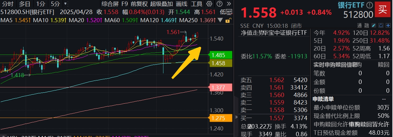 今日銀行板塊全天逆市走強,延續對等關税事件以來的強勁防禦性。A股頂流銀行ETF(512800)場內價格一度漲逾1%,收漲0.84%,全天成交額3.16億元,環比放量。