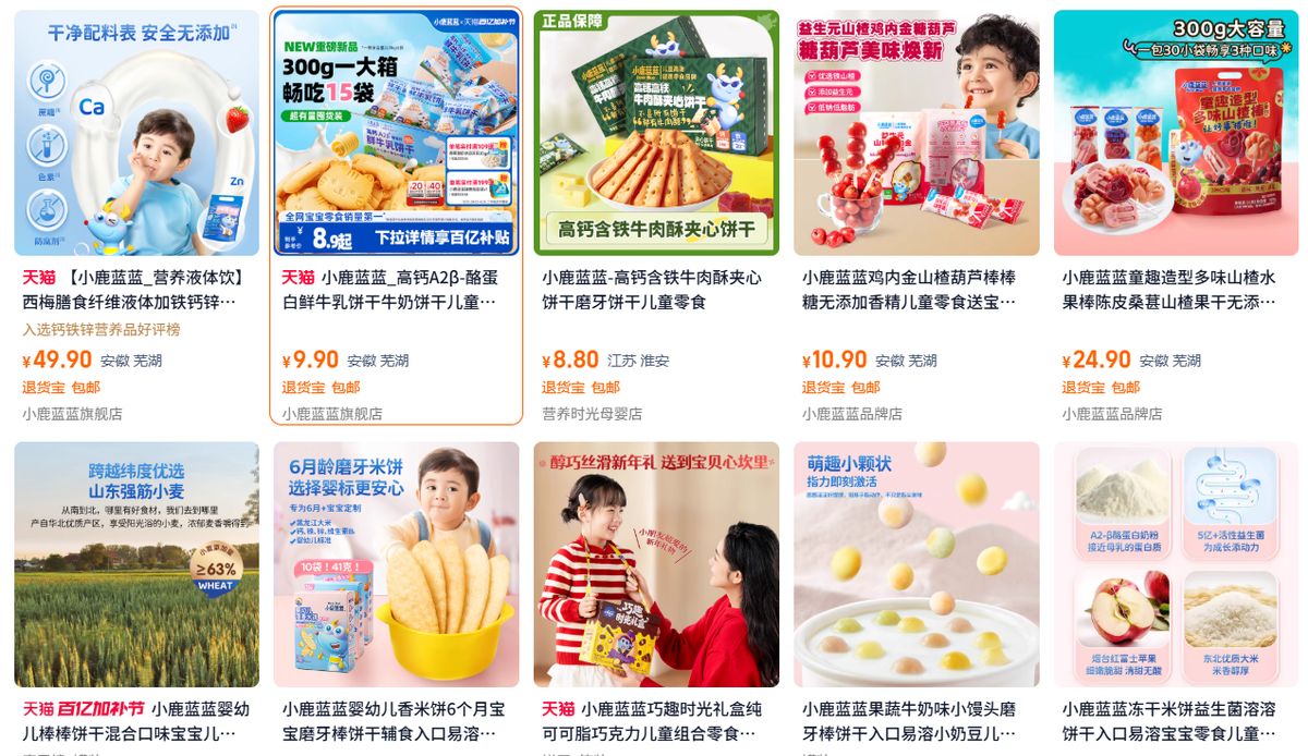 而三隻松鼠雖然正從“電商零食標籤”向“全域食品平台”躍遷,除去擁有超20款億級大單品的核心品類堅果外,還推出了辣滷禮包、高蛋白肉脯、手撕麪包等爆款產品,更孵化了10億級定位兒童高端健康零食的子品牌“小鹿藍藍”。