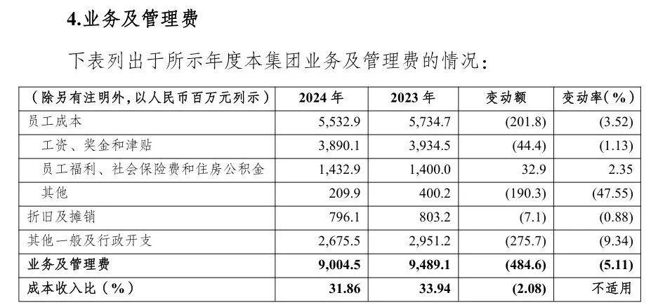 年報顯示,2024年重慶農商行業務及管理費為90.05億元,同比減少4.85 億元,降幅5.11%。