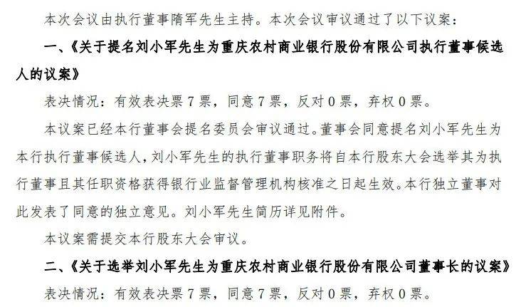 4月16日,重慶農商行公告稱,董事會提名劉小軍為執行董事候選人,選舉劉小軍擔任本行第五屆董事會董事長。