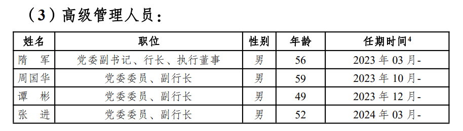 可見,隋軍在這一輪變動中,曾一肩挑起行長、董事長和董秘三大核心職務。隨着“新掌門”的上任,隋軍“一肩挑三職”局面結束。