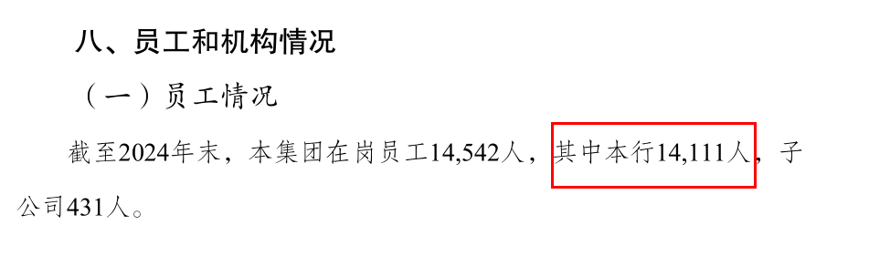 成本下降的同時,員工人數也在所下降。截至2024年末,重慶農商行員工人數為14111人,較2023年末減少479人。