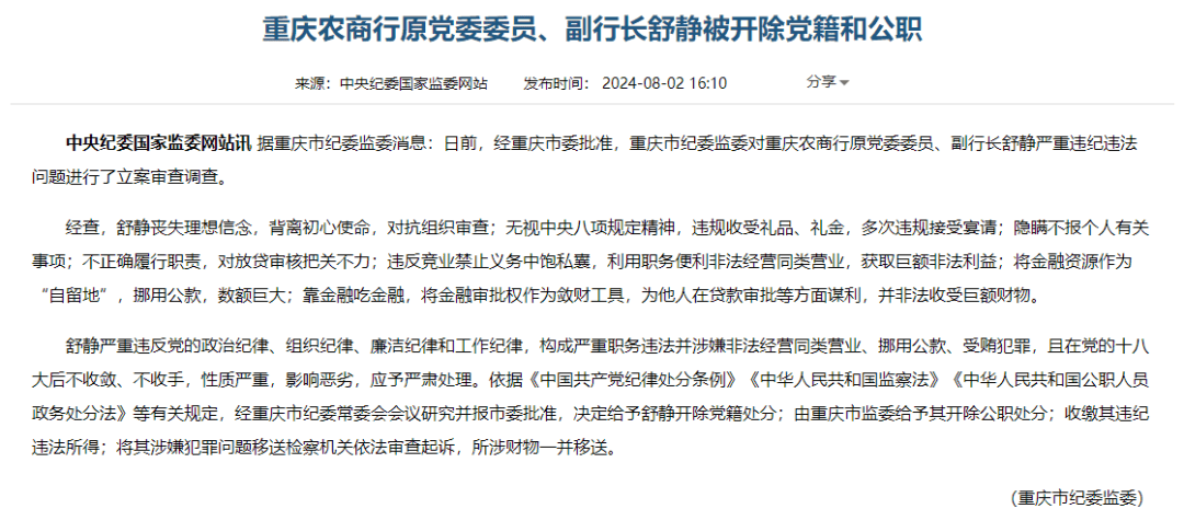 2024年3月28日,重慶農商行董事會決議解聘舒靜副行長職務。在她被解聘後的第二天,據重慶市紀委監委發佈消息,舒靜涉嫌嚴重違紀違法,正接受市紀委監委紀律審查和監察調查。2024年8月2日,舒靜涉及7項違法違規行為,被開除黨籍和公職。