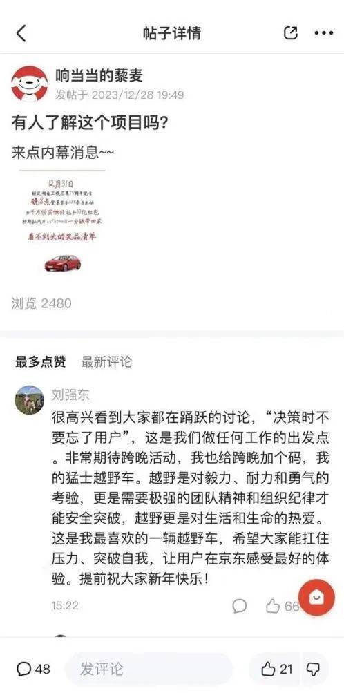 正如劉強東去年12月在一則帖子下的留言,“‘決策時不能忘了用户’,這是我們做任何工作的出發點”。京東汽車的一系列動作,是對户外與越野消費覺醒的呼應。