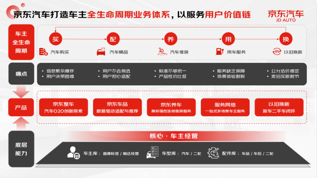 連接層,線上的超6億優質用户,超2億車主,線下的超2200家京東養車門店、超4.6萬合作門店的服務網絡,讓京東有了線上線下聯動的全域生態。