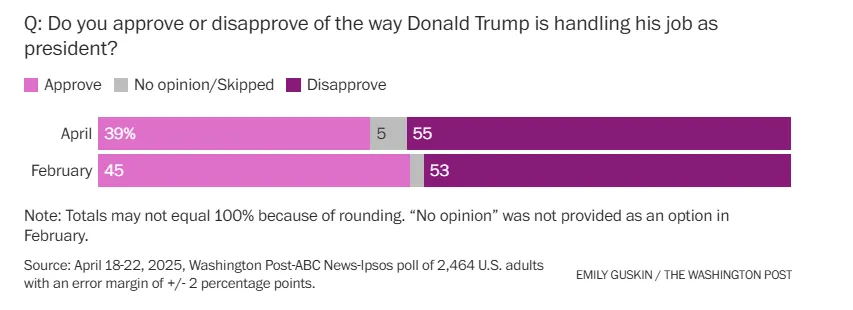 ▲《華盛頓郵報》發佈的民調中顯示,特朗普的支持率從2月的45%掉到了如今的39%。