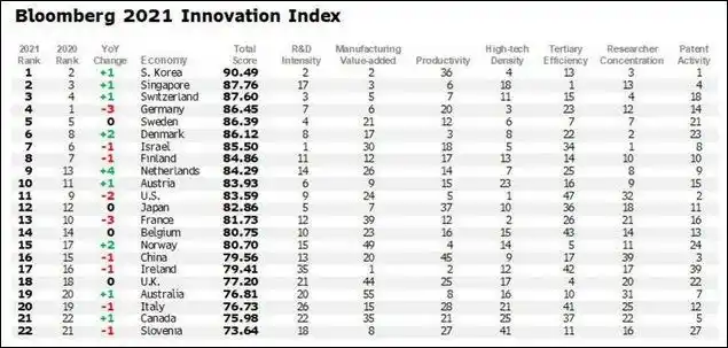 2021年2月2日,美國彭博社發佈了《彭博創新指數排名》,韓國排名世界第1,日本僅排在第12名。