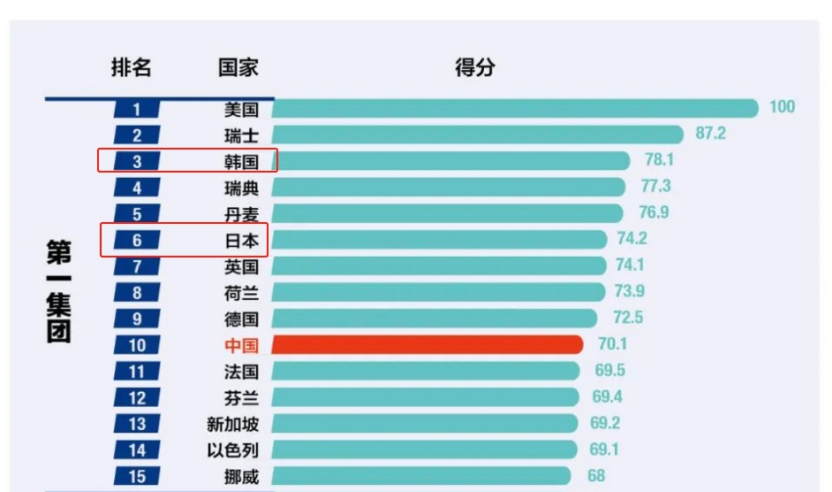 韓國得分78.1,位居全球第三、亞洲第一。日本得分為74.2,位居全球第六、亞洲第二。