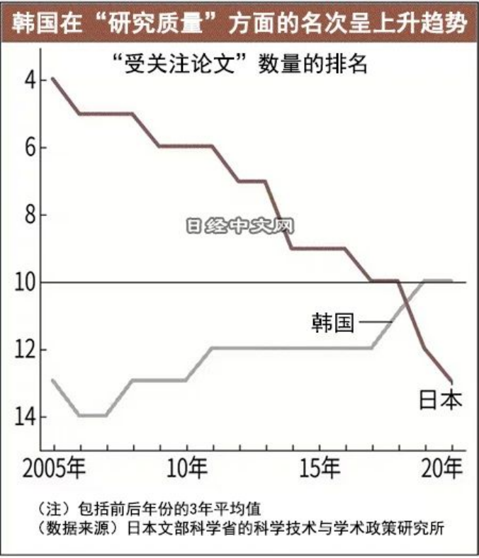 日本文部科學省統計發現,韓國的“受關注論文”數量(即被其他論文引用的次數排在前10%的論文)排名不斷上升,於2019年超越日本。