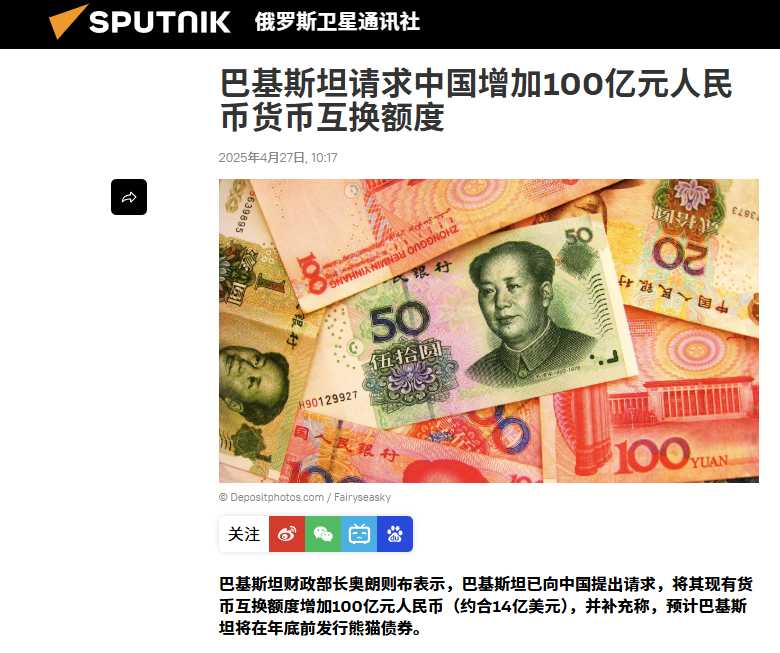 而貨幣互換協議,允許兩國央行在約定匯率下交換本幣,用於跨境貿易結算。新增100億元人民幣額度,意味着巴基斯坦可通過該協議,直接從中國央行兑換人民幣進口中國商品,這相當於中國為巴基斯坦提供了一筆“戰時應急資金”。