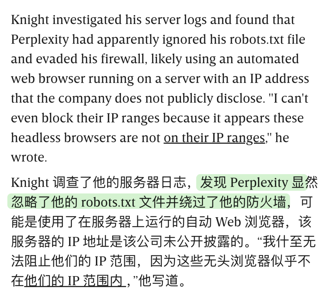 再比如 perplexity 也被科技媒體 WIRED 抓包過,根本無視 robots 協議。