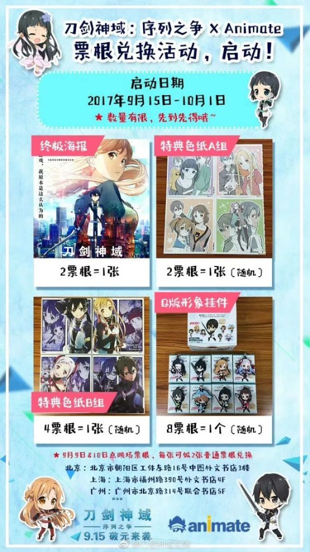 像《輕音少女劇場版》那樣,需要觀眾提供複數票根才能兑換到特典,代表案例是2017年的《刀劍神域:序列之爭》。本作在北京、上海和廣州開啓了票根兑換活動,2-8張票根分別可以兑換到不同類型的周邊。