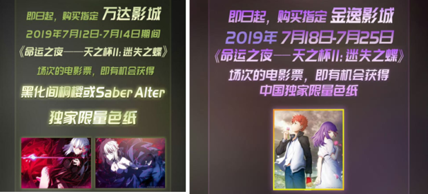 如2019年上映的《命運之夜——天之杯:迷失之蝶》就準備了兩輪入場特典:第一輪黑櫻與黑呆的特典限定萬達影城,第二輪中國獨家限量色紙限定金逸影城。