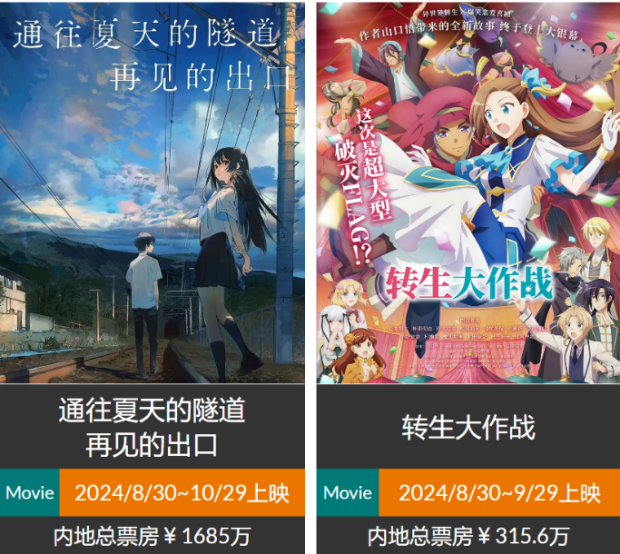 2024年,中國電影總票房為425億元,票房排名前十的作品中僅有一部日本動畫,為7.9億票房的《你想活出怎樣的人生》。許多小眾冷門的作品粉絲基數少、片方也不願投入太多宣發資源,甚至有的已在流媒體上線,因此票房表現慘淡、排片數自然也少。