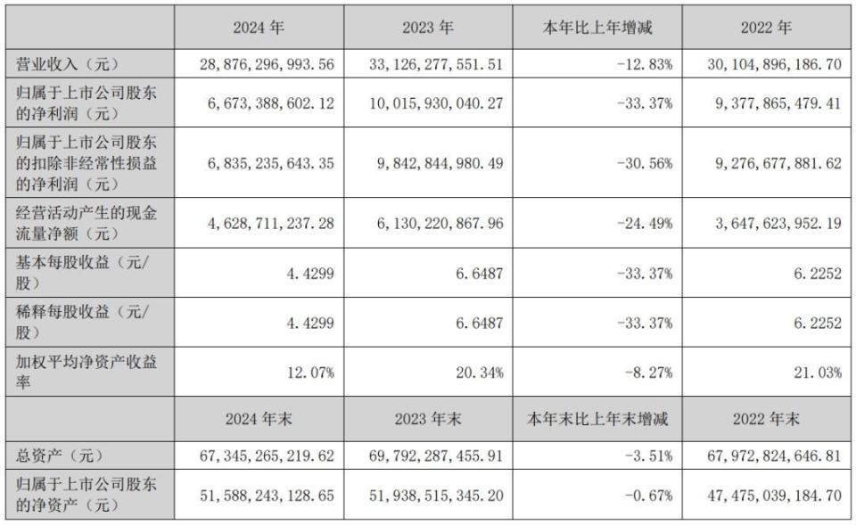 4月28日晚,洋河股份(002304.SZ)也發佈了2024年年報和2025年第一季度報告,2024年洋河實現營收288.76億元,歸屬於上市公司股東淨利潤66.73億元。