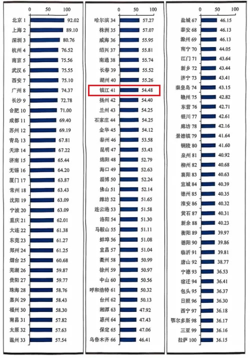 鎮江排名全球第77,在上榜的中國城市(羣)中排名第22,是江蘇僅有的3個上榜城市之一。