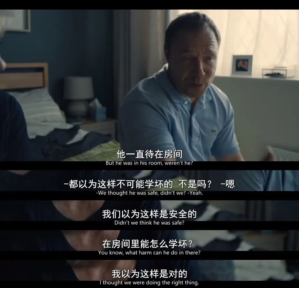 另一方面,這種視角讓觀眾更能與劇中角色同步共情——在第1集中像大清早被拉去警局的Jamie一家一樣懵圈,在第2集中像身處污糟學校的警官們一樣窒息,在第3集中像心理專家一樣因直面Jamie變臉而悚然。
