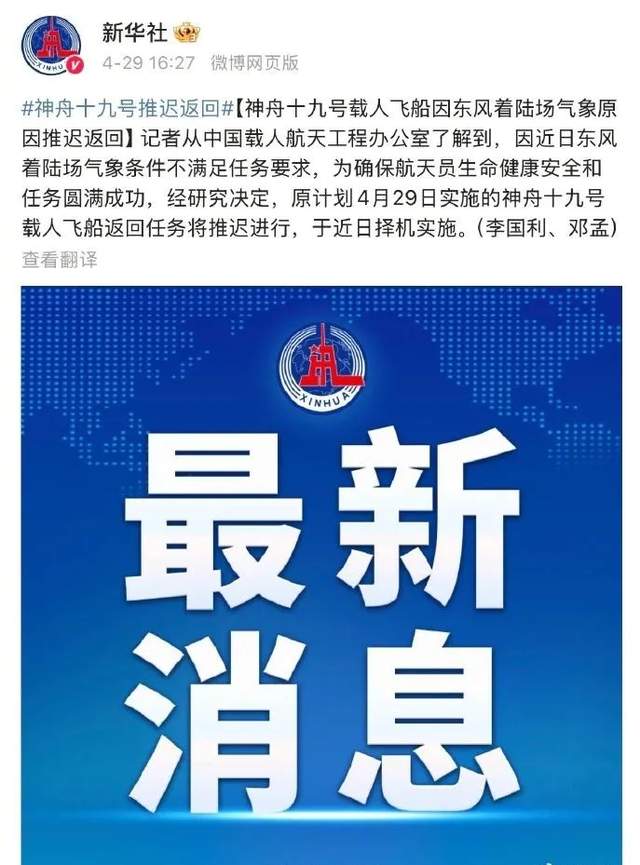 載人航天辦公室正式公佈消息,神舟十九號因為東風着陸場氣象條件不滿足任務需要,推遲了原定於29日的返回任務,準備擇機實施。而根據蘭州飛行情報區“給飛行員通知”(NOTAMS),神舟十九號將在4月30日12:49-13:19返回東風着陸場。