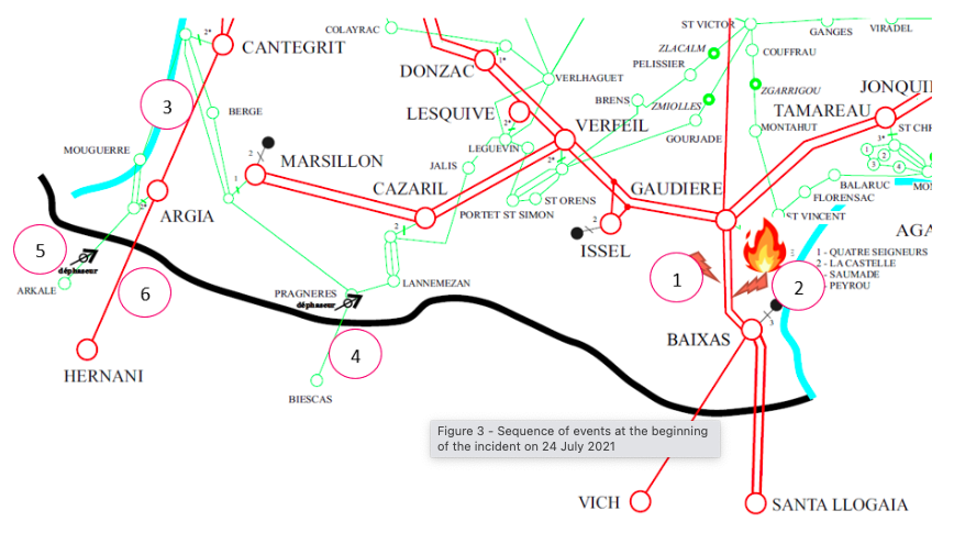 • 16:35:在減量措施實施前,同區域的400千伏Baixas Gaudières 1線路跳閘(標記2),導致(N-2)事故及法西東部互聯線路功率流中斷。