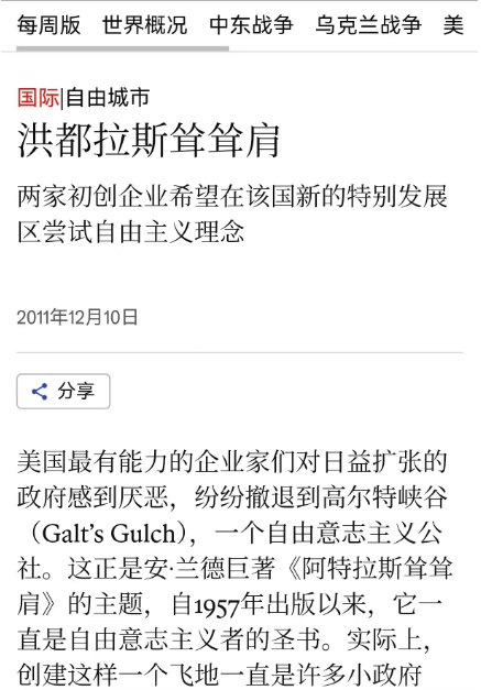 至於到了今天還在受熱捧,**主要是因為硅谷的諸位新生勢力真的把自己帶入進了約翰高爾特的身上,**相信自己是被各種制度限制了,他們真的相信自己是託舉世界的阿特拉斯。筆者在以前文中曾經提到過,很多硅谷新貴正在贊助一些無政府資本主義社區的實驗,而這些項目的名字,很容易和《阿特拉斯聳聳肩》扯上關係,洪都拉斯和薩爾瓦多都有這類實驗。