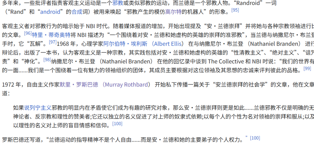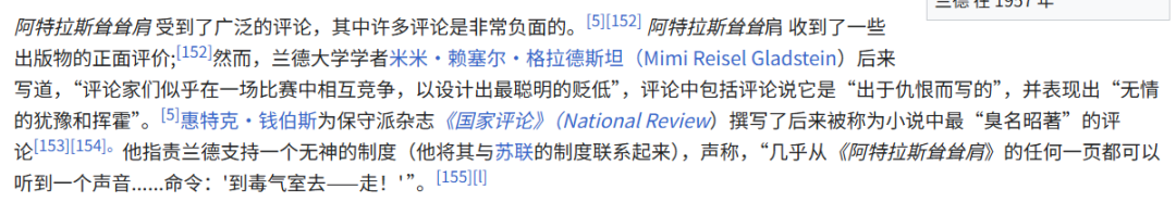 還有個成分複雜之處,安蘭德並不受美國保守主義者們的歡迎,因為在她的客觀主義理論中沒有宗教或是神明的位置。因為這點,美國保守派的文學評論認為安蘭德是某種蘇聯制度的支持者。類似的事情倒也發生了不止一次,比如説對於真正的保守主義者來説,“歷史終結”論是和馬克思主義同樣糟糕的歪理邪説,但是奈何美國人民就是好這一口,所以福山就成了座上賓。