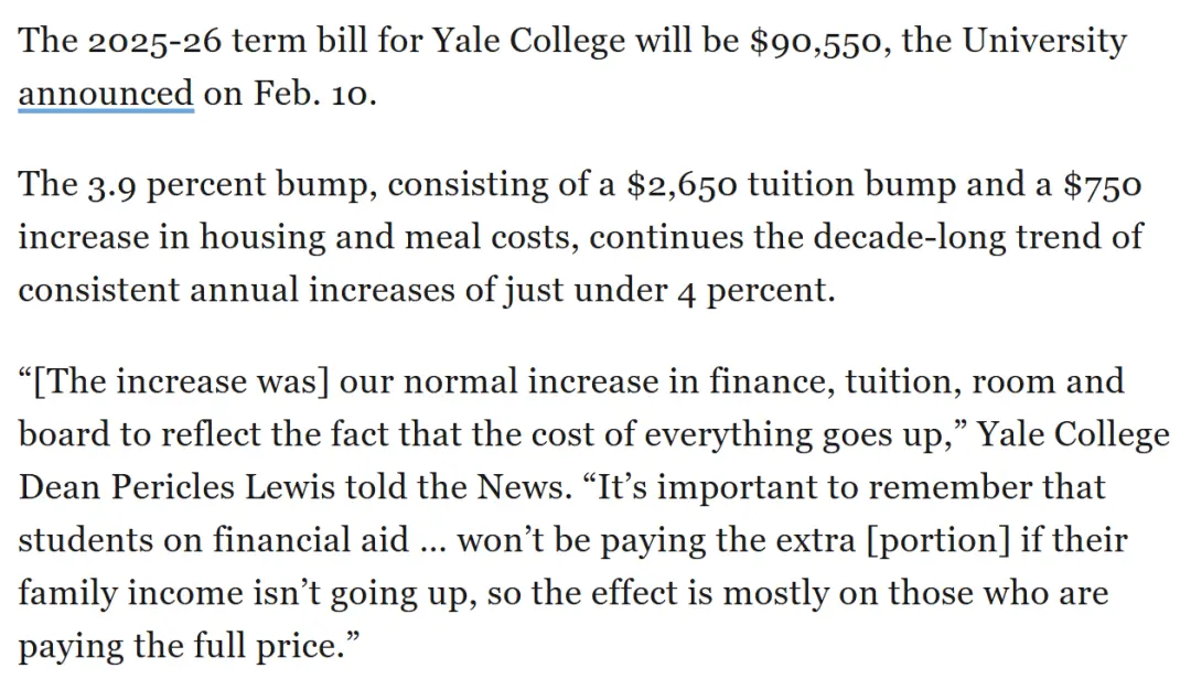 2月10日,耶魯大學宣佈2025-26學年的新收費標準,本科生就讀費用(包括學費、住宿和餐費)從87,150美元上漲至90,550美元。其中,學費從去年的67,250美元上調至69,900美元,校內住宿學生的住宿和餐費為20,650美元。