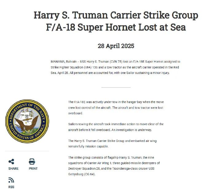 根據USNI News報道,當地時間4月28日晝間,美國海軍“杜魯門”號航母打擊羣在實施艦載機提升整備期間,有一架F/A-18E/F型艦載戰鬥機連帶它的牽引小車,“不慎墜海”。戰鬥機和牽引車一起丟到海里去了……這本來就是個比較扯的事情,更扯的事情在於這事兒到底是怎麼出來的?還好美國海軍沒藏着掖着,該報的人都報了。