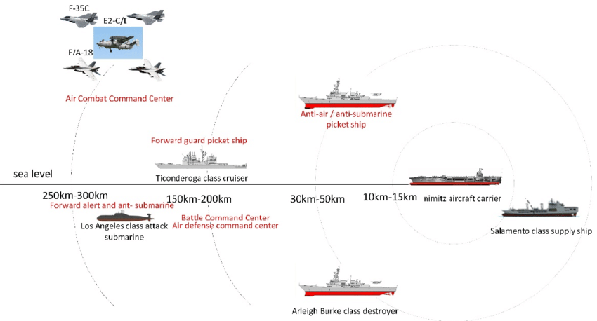 我們都知道哈,航空母艦它的防禦是多層次防禦。從最外層由預警機組成的態勢感知區域,到中層由防空艦組成的態勢感知區域,同時還會配套陸基雷達、陸基偵察機、天基偵察衞星等,態勢感知範圍在數百千米到上千千米不等。