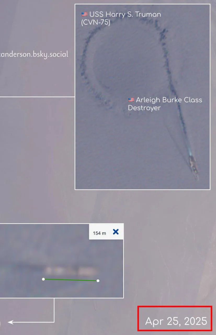 網傳疑似杜魯門號航母緊急機動的衞星照片