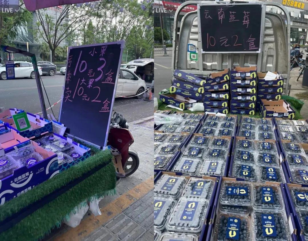 藍莓從冷藏櫃裏的“精品標配”走向街邊攤的“清倉促銷”,一盒只賣9.9元,甚至10元兩盒;