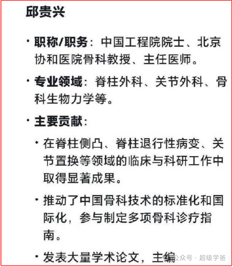 邱院士何許人也?是工程院院士,全國頂級骨科專家,也是這位董天才的導師。董同學的能量驚人啊,據説他外公也是院士,爺爺也是協和畢業的行業大拿。